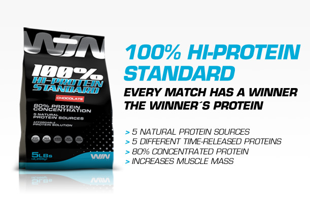 AWIN Nutrition desenvolveu a 100% Hi-Protein Standard com o objetivo de satisfazer as necessidades de atletas profissionais e de todas as pessoas que praticam esportes, que de uma forma geral querem atingir os seus objetivos. 100% Hi-Protein Standard contém uma fórmula própria com múltiplo tempo de libertação para que o fornecimento de proteína seja constante durante um longo período de tempo, isto evita que o seu corpo entre em estado catabólico(perda de músculo) para além disso prolonga por mais tempo a sensação de saciedade evitando a ingestão excessiva de calorias na alimentação.